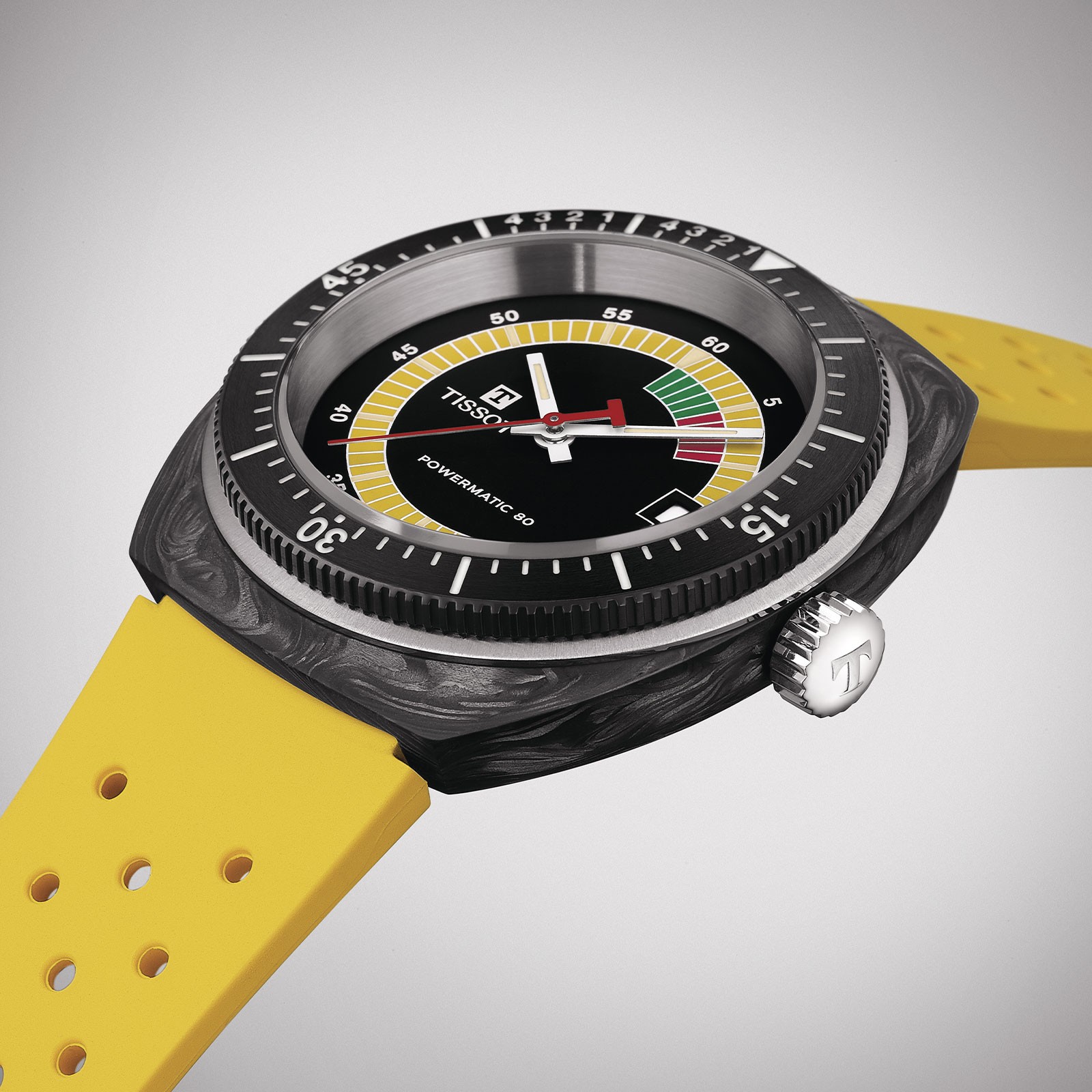 Discover the Tissot Sideral, a captivating fusion of vintage allure and modern craftsmanship. The watch features a 41mm wide forged carbon case and a vibrant yellow strap, paying homage to its iconic 1970s roots. The dial displays a multi-coloured luminescent animation, enhancing its unique charm. Water-resistant up to 30 bar (300 meters) and equipped with Super-LumiNova® coated indices, the Sideral is a statement piece for trendsetters and history enthusiasts. The interchangeable perforated rubber strap allows for effortless style adaptation. Embrace the extraordinary with the Tissot Sideral. Shop Tissot watches at Chisholm Hunter today.