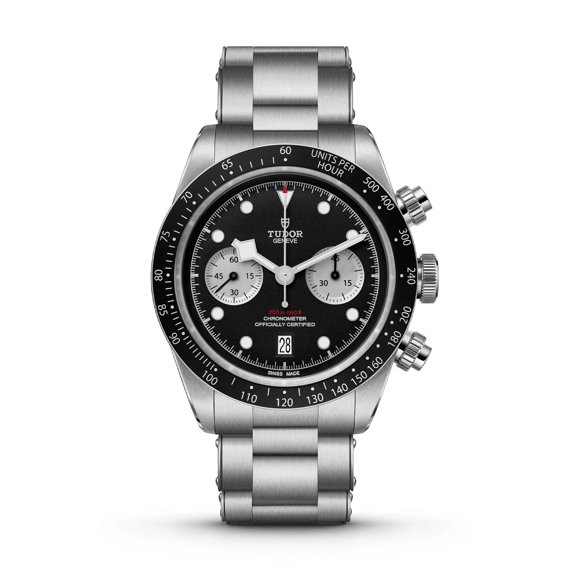 The TUDOR Black Bay Chrono is designed for everyone. Its metal bracelet, secured with a folding clasp, guarantees a snug and comfortable fit. This watch belongs to the esteemed Black Bay Chrono collection, known for its robust design and traditional watchmaking excellence.