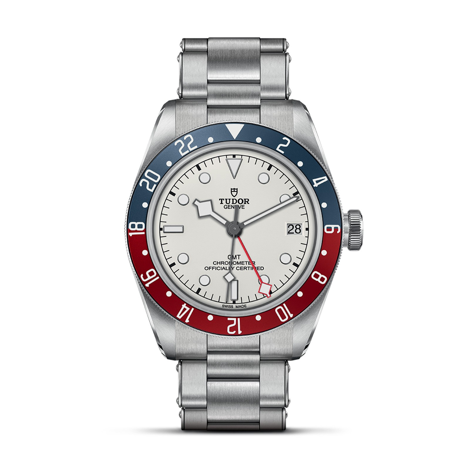 TUDOR's famous Black Bay divers' watch is available with a GMT function that establishes local time without losing sight of the time in two other time zones. Fitted with the Manufacture Calibre MT5652, the Black Bay GMT sports a 24-hour graduated rotating bezel with two colours.
