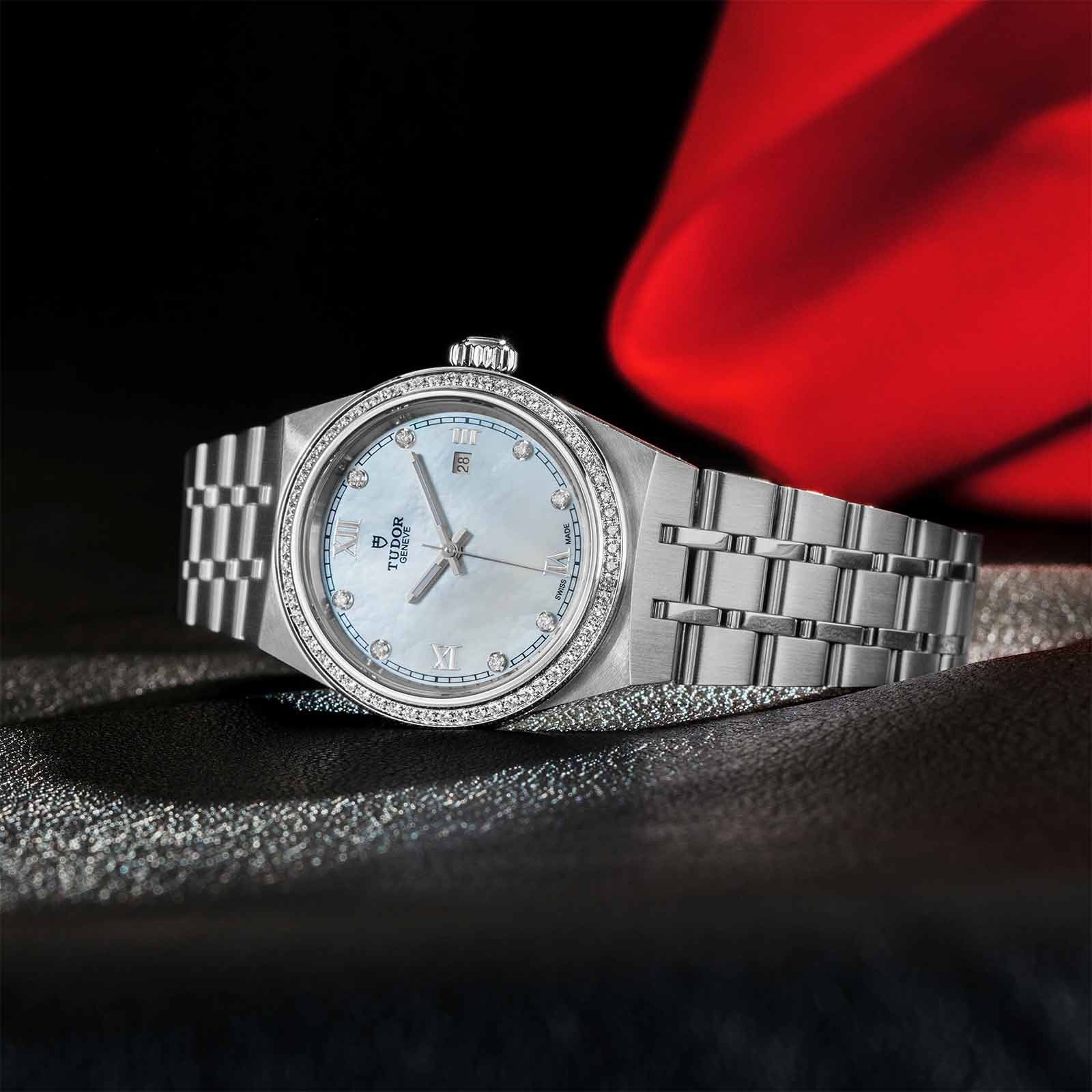 Executed in stainless steel with diamond hour-markers, a stunning mother-of-pearl dial and day-date complication, the Tudor Royal M28320-0001 is a stunning new addition to Tudor's lineup. The design language of the Tudor Royal is a perfect re-interpretation of vintage chic with modern elements, such as the diamond-set fixed bezel and integrated bracelet. Additionally, the ‘5-link’ design of the bracelet was first introduced by Tudor in 1973 and has been reprised for the new collection to add that extra level of vintage authenticity.