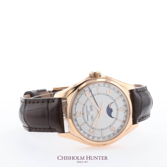 An iconic model dated by 1956 Vacheron Constantin. This collection indulges in lines composed of the combination between a classic dial and design of the case, expressing an elite cosmopolitan style. The reinterpreted models are noticeably inspired by the Maltese cross-shaped emblem which is also recognisable on the open worked pink gold oscillating weight. The Fifty-six Complete Calendar showcases a silver dial with alternating even Arabic Numerical markers and the essential hands. The dial is detailed with the complications of the day-date function under the 12 o'clock position, additionally providing the moon phase functionality positioned at 6 o'clock, with an inner monthly calendar as an inner railroad. Presented on a Mississipplensis dark brown alligator leather strap, the 40mm 18ct Rose Gold case hosts the dial, set beneath sapphire crystal glass for protection. Powered by a self-winding Calibre 2460 QCL/1 movement , this high precision Fifty-six Edition watch is certified by the Hallmark of Geneva. The timepiece transparent case back and 40 hour power reserve is exquisite in the technical components of this timepiece. This timepiece is water resistant to 30 metres. All Vacheron Constantin collections are presented with a 2-year international warranty.