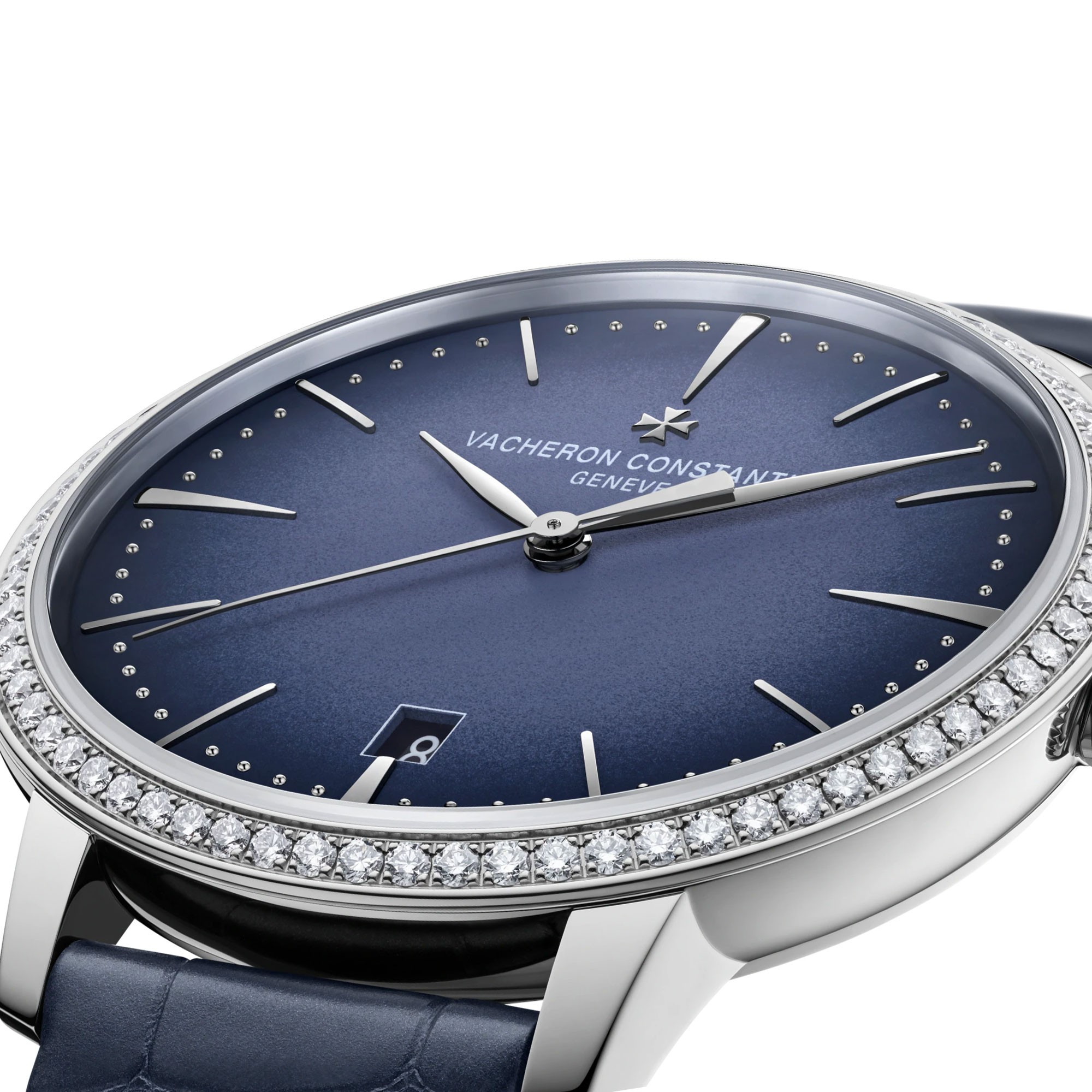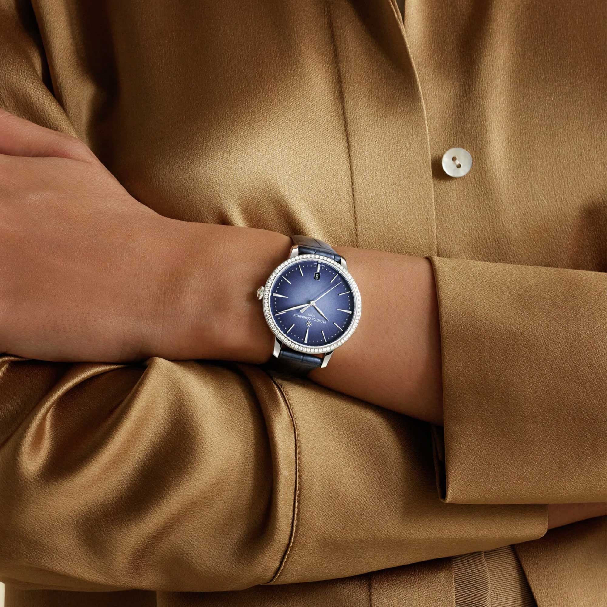 Faithful to its understated, timeless elegance inherited from the 1950s, this self-winding watch has a refined feminine identity, featuring a redesigned curvature with a slightly domed gradient tone dial. With a diameter of 36.5 mm, it comes in 18K white gold with a deep blue dial, a bezel set with 72 diamonds, and a circular-grained minute-counter. The seeming simplicity of the self-winding Patrimony is the result of meticulous attention to detail, as further evidenced by the finishes on its 2450 Q6/3 caliber, displaying the hours, minutes, seconds and date. It features an interchangeable strap that can be released by pressing lightly on a single-push button, with no need for a tool.