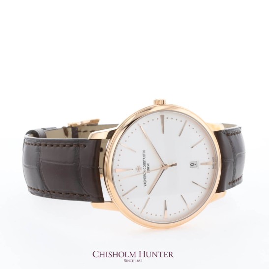 Circular and classic; the Patrimony collection is the epitome of minimalism. It is distinct as a collection through its slender cases showcasing a grandeur inspired by 1950s Vacheron Constantin models. Showcasing a white dial, this Patrimony timepiece has fine detailing of rose-gold tone hands and hour markers. As an additional complication the dial features a date window at the 6 o'clock position. Protected by sapphire crystal glass, the dial is housed by a stunning 40mm 18ct Rose Gold case. Presented on a Mississipplensis dark brown alligator leather strap; finished with the distinct Maltese Cross detailing on the fastening of the trillion buckle. Powered by a self-winding movement Calibre 2450 Q6/3 movement, this high precision timepiece provides a 40-hour power reserve and is water resistant to 30 metres. All Vacheron Constantin collections are presented with a 2-year international warranty.