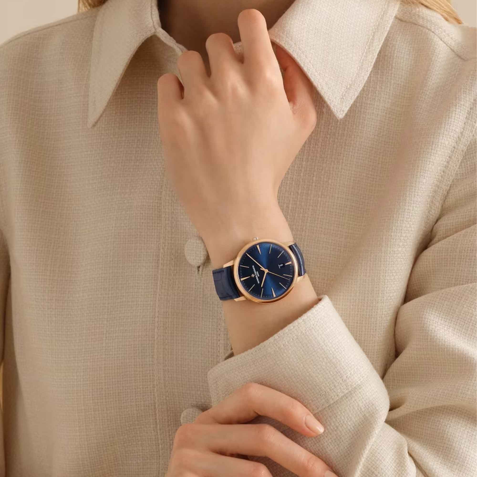 Circular and classic; the Patrimony collection is the epitome of minimalism. It is distinct as a collection through its slender cases showcasing a grandeur inspired by 1950s Vacheron Constantin models. Showcasing a navy dial, this Patrimony timepiece has fine detailing of rose-gold tone hands and hour markers. As an additional complication the dial features a date window at the 6 o'clock position. Protected by sapphire crystal glass, the dial is housed by a stunning 40mm 18ct Rose Gold case. Presented on a Mississipplensis dark blue alligator leather strap; finished with the distinct Maltese Cross detailing on the fastening of the trillion buckle. Power by a self-winding movement Calibre 2450 Q6/3 movement, this high precision timepiece provides a 40-hour power reserve and is water resistant to 30 metres. All Vacheron Constantin collections are presented with a 2-year international warranty.