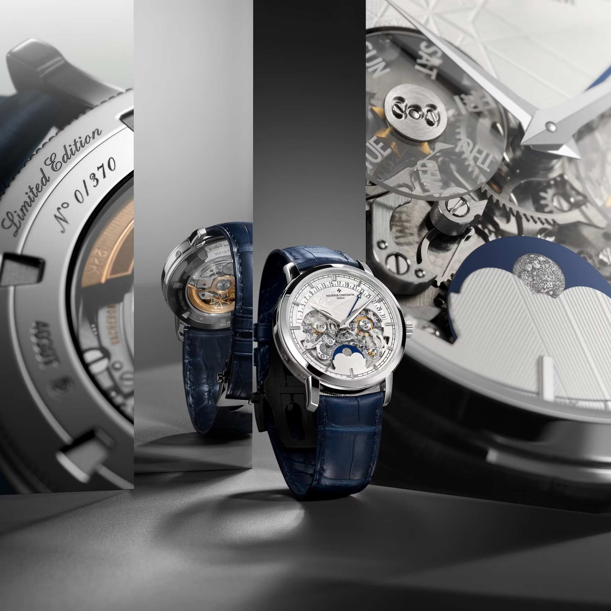 This timepiece, its case entirely sculpted in 950 platinum, brings together mechanical prowess and avant-garde vision. Issued in a limited edition of 370 pieces for Vacheron Constantin’s 270th anniversary, the watch sports a discreet anniversary signature and a "côte unique" finish. An openface dial adorned with a hand-guilloché Maltese cross pattern reveals the beauty and power of its new self-winding movement. A perpetual calendar boasts a retrograde date as well as a high-precision moon phase, while the Traditionnelle Collection’s classic styling is fully upheld: a stepped round case and lugs, slender bezel and fluted caseback, railway-type minute track and Dauphine-type hour and minute hands.