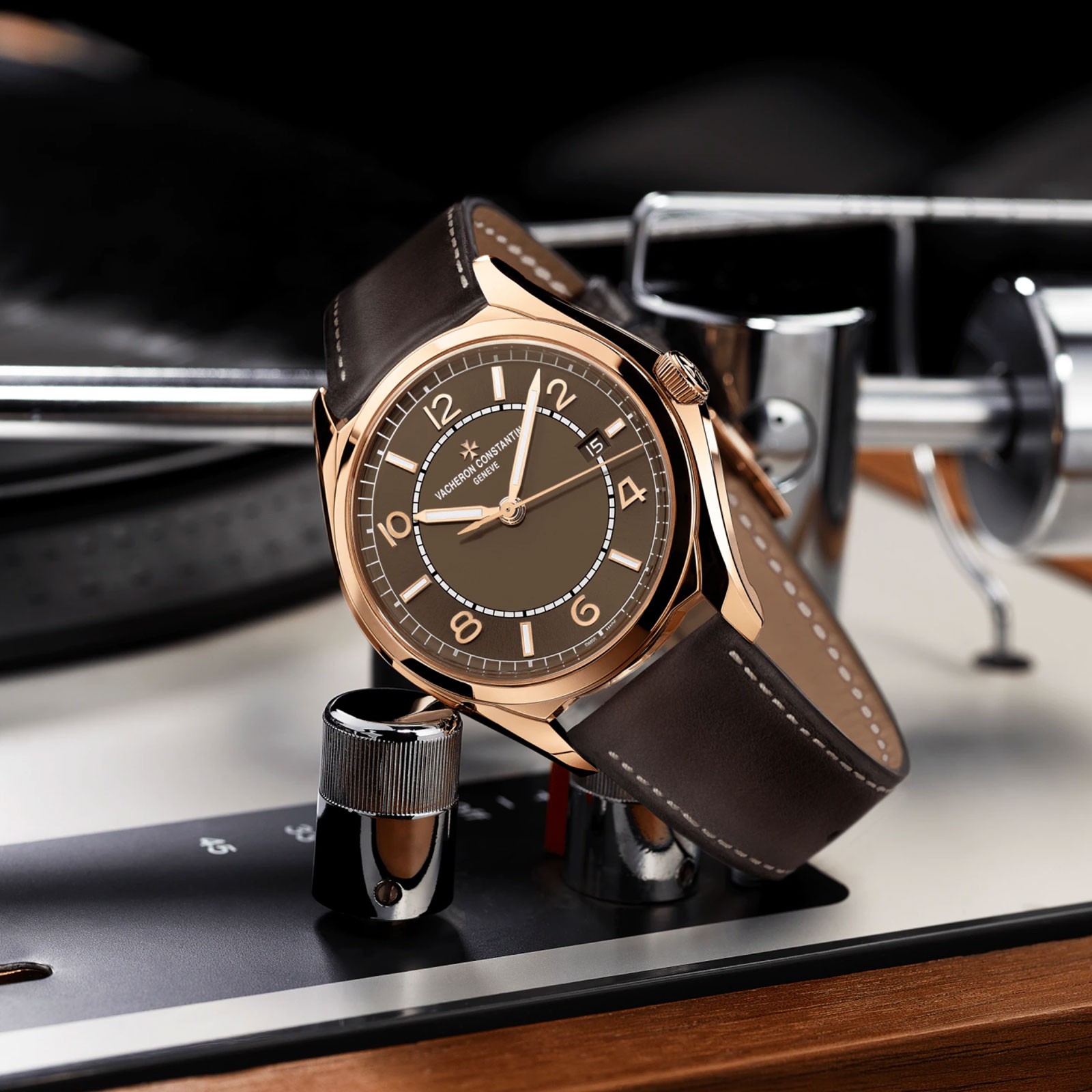 An iconic model dated by 1956 Vacheron Constantin. This collection indulges in lines composed of the combination between a classic dial and design of the case, expressing an elite cosmopolitan style. This watch showcases a brown dial with alternating even Arabic Numerical markers and the essential hands in a 18ct Rose Gold tone. The dial is detailed with the complication of the date function at the 3 o'clock position. Presented on a dark brown calfskin leather strap, the 40mm Rose Gold case hosts the dial, set beneath sapphire crystal glass for protection. Powered by a self-winding Calibre 1326 movement , it displays the Côtes de Genève finishing and an oscillating weight in 22K pink gold, whose shape is inspired by the Maltese cross. This high precision Fifty-six Edition watch has a transparent case back and 48 hour power reserve which is exquisite in the technical components of this timepiece. All Vacheron Constantin collections are presented with a 2-year international warranty.