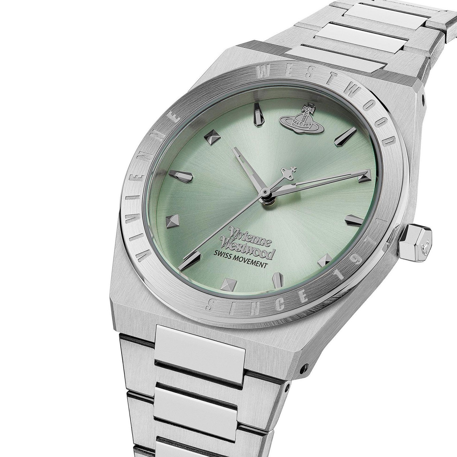 Elegant and contemporary, Vivienne Westwood Charterhouse takes its name and inspiration from Charterhouse Street, situated in the famous London jewellery quarter, Hatton Garden. The newest addition to the range this season features the signature Vivienne Westwood logo engraved on the bezel with sunray dials and faceted indices, which beautifully reflect the light. The 39.5mm case with 50m water resistance is presented on a stainless steel bracelet and finished with a butterfly clasp. Boasting a stylish and sleek aesthetic with a luxurious green dial with stainless steel hands and hour markers. Enhanced with stylish detailing, add everyday designer glamour as this timepiece is sure to compliment every look. Perfect for lovers of designer style.