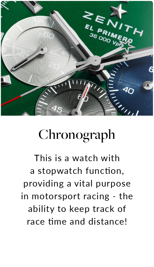 Traveling at high speeds means drivers can only afford a quick glance at their watch. High-contrast dials give the seconds hand and chronograph counters more legiblity.