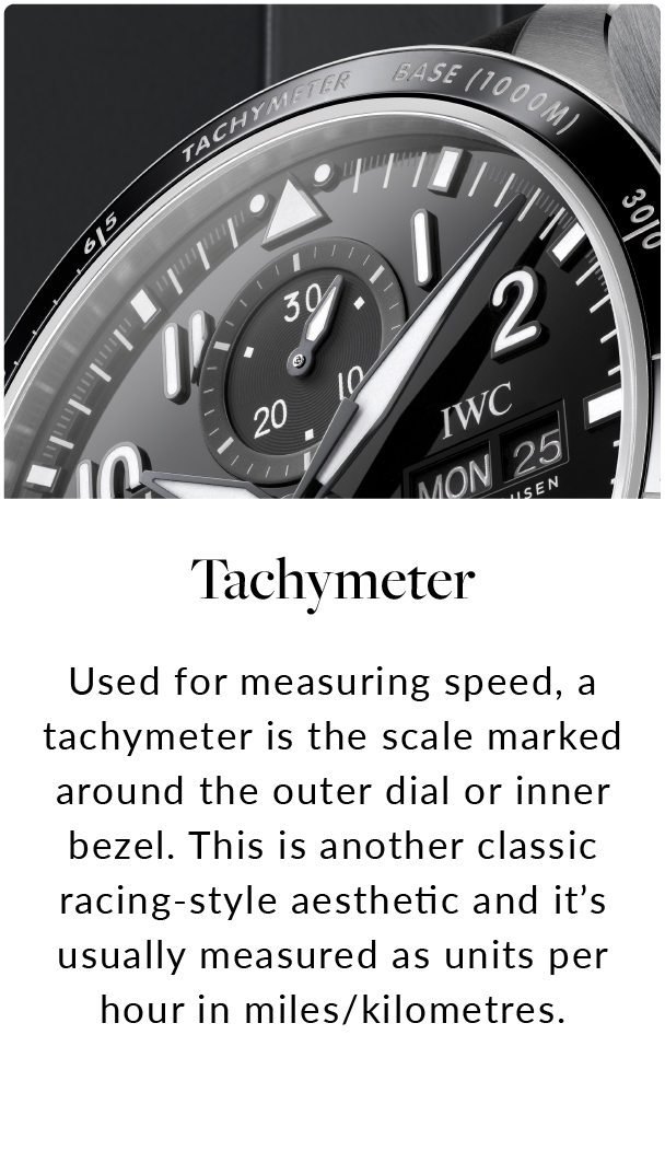 Used for measuring speed, a tachymeter is the scale marked around the outer dial or inner bezel. This is another classic racing-style aesthetic and it’s usually measured as units per hour in miles/kilometres.