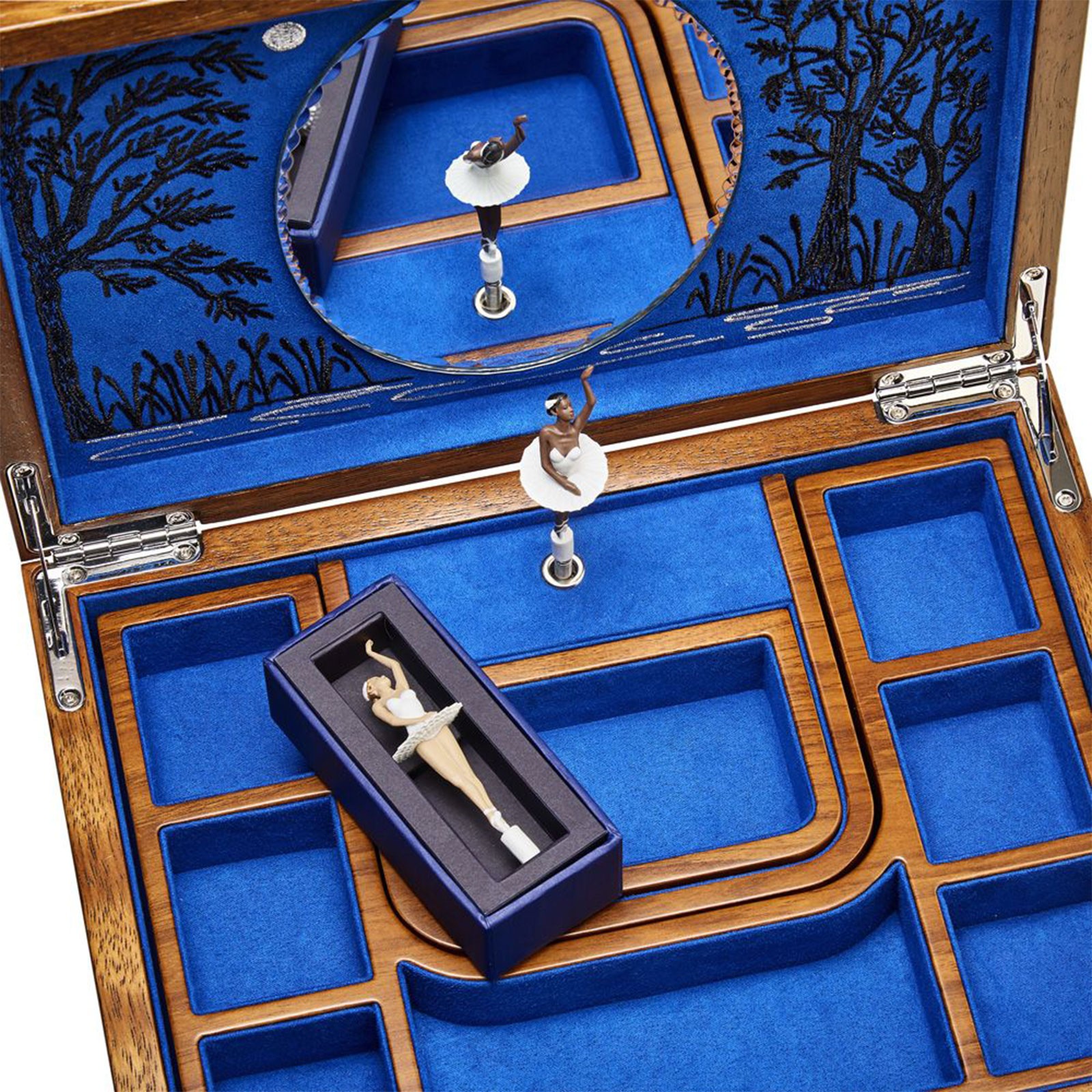Inside, a Swan Lake embroidered grand theatre design by Fiona Howard surrounds the custom scallop-edged mirror above handmade walnut wood compartments with LusterLocâ„¢ treated ultrasuede lining. The box comes with two interchangeable ballet dancers with different skin tones who begin to dance to Tchaikovsky's Swan Lake by winding the silver 'W' key.