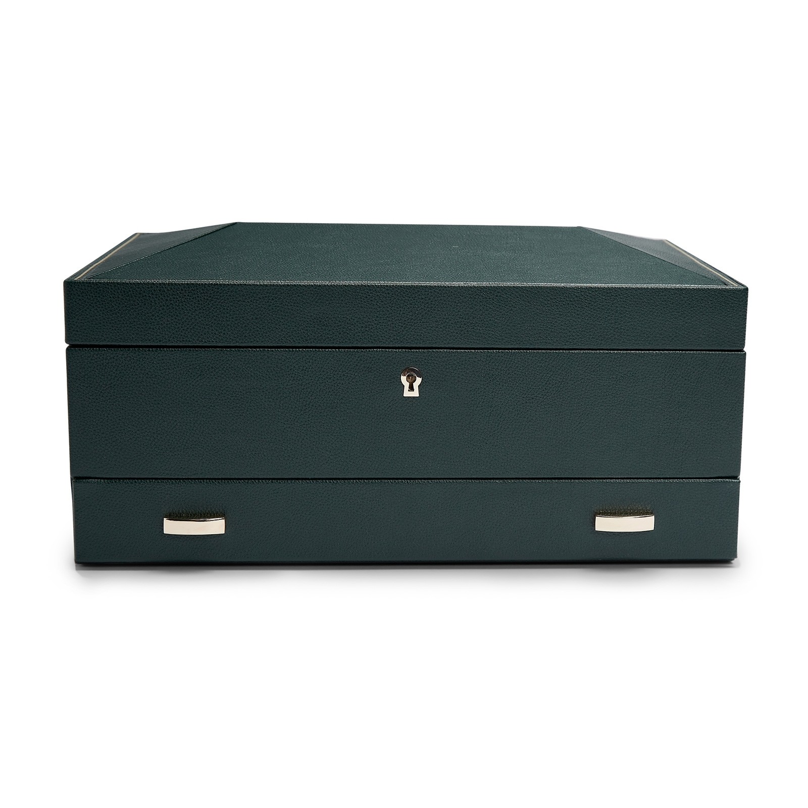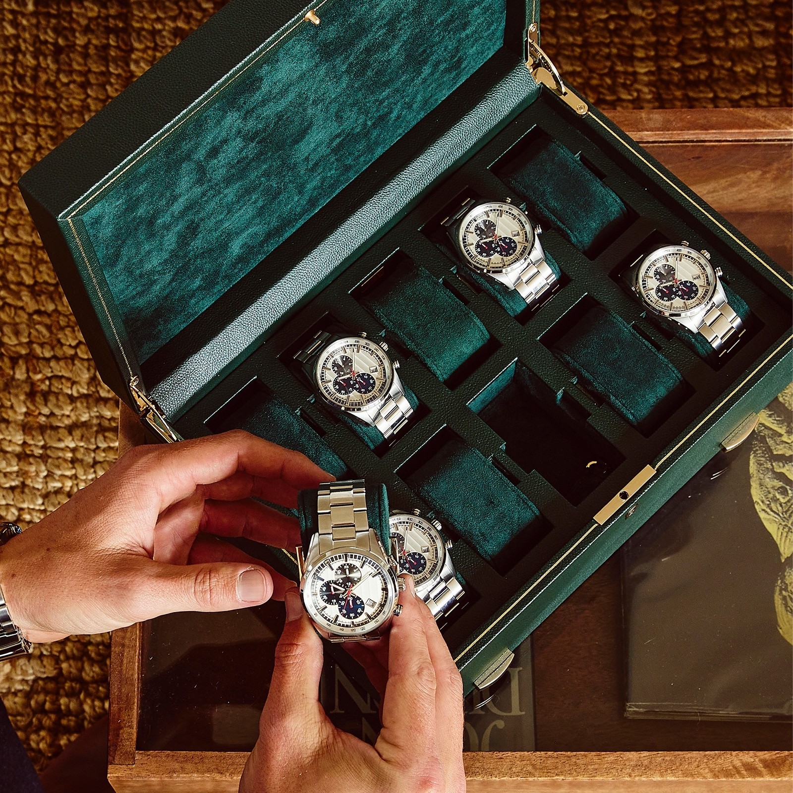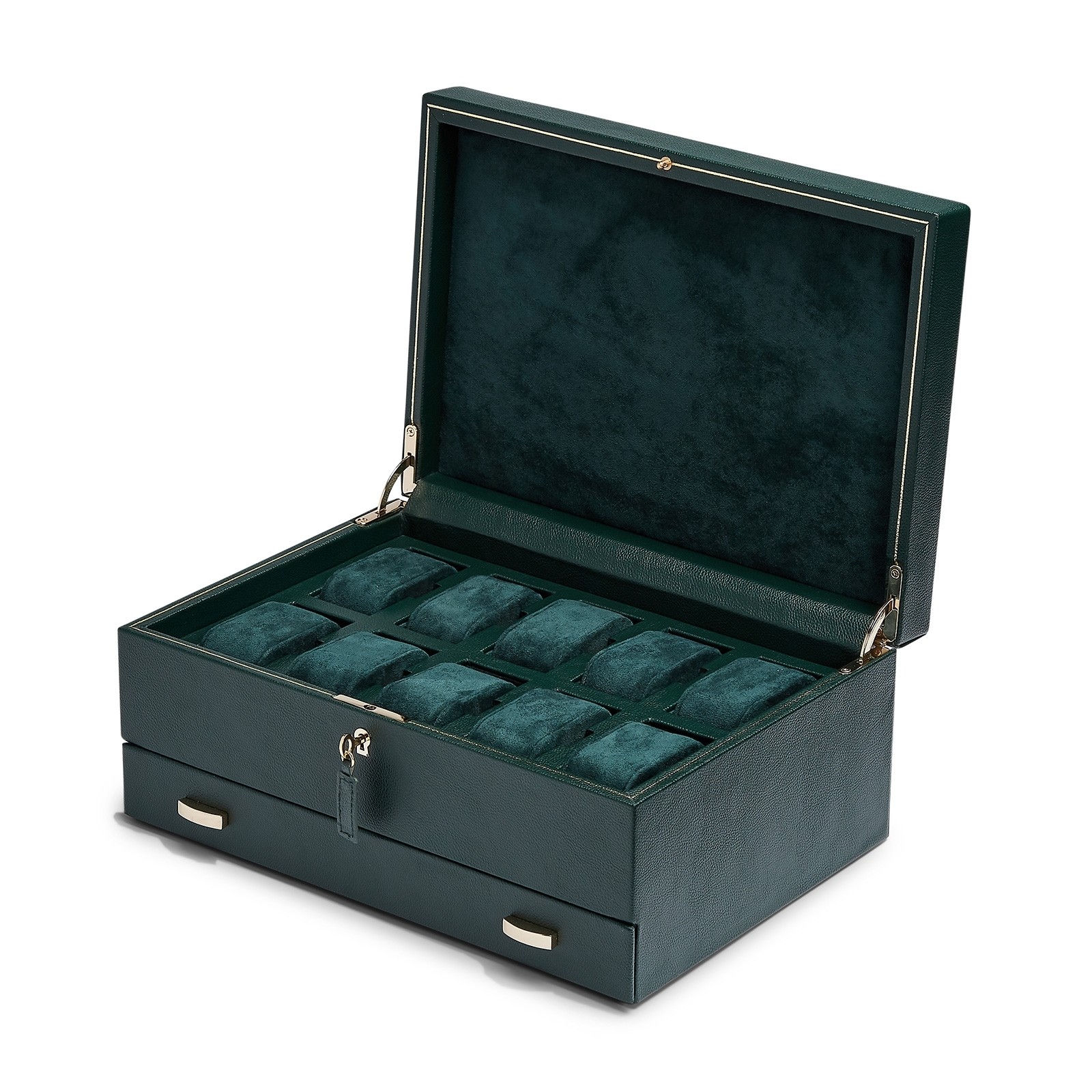Practical yet stylish, this Wolf Watch Box has storage for 10 watches. Handmade, the British Racing models combines the green international motor racing colour of the UK's cars, that were raced in Ireland in the early 1900's, with a revolutionary quad angled and panelled lid. Fine hand finished details include fine gold lines hand pressed onto vegan friendly pebble grained leather. Gold hardware accents add a touch of luxury. Size: 30.02cm length x 22.86cm width x 15.88cm height.