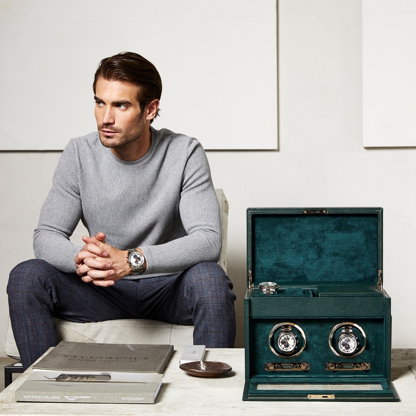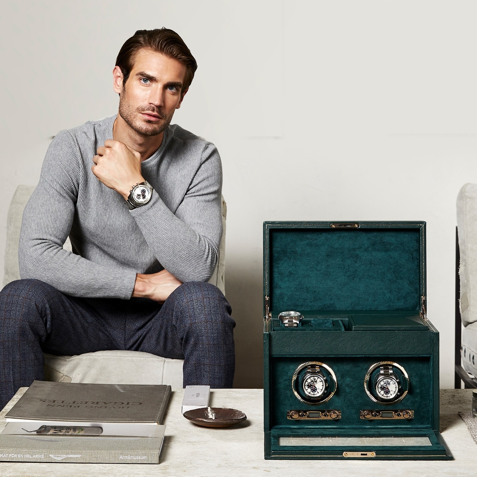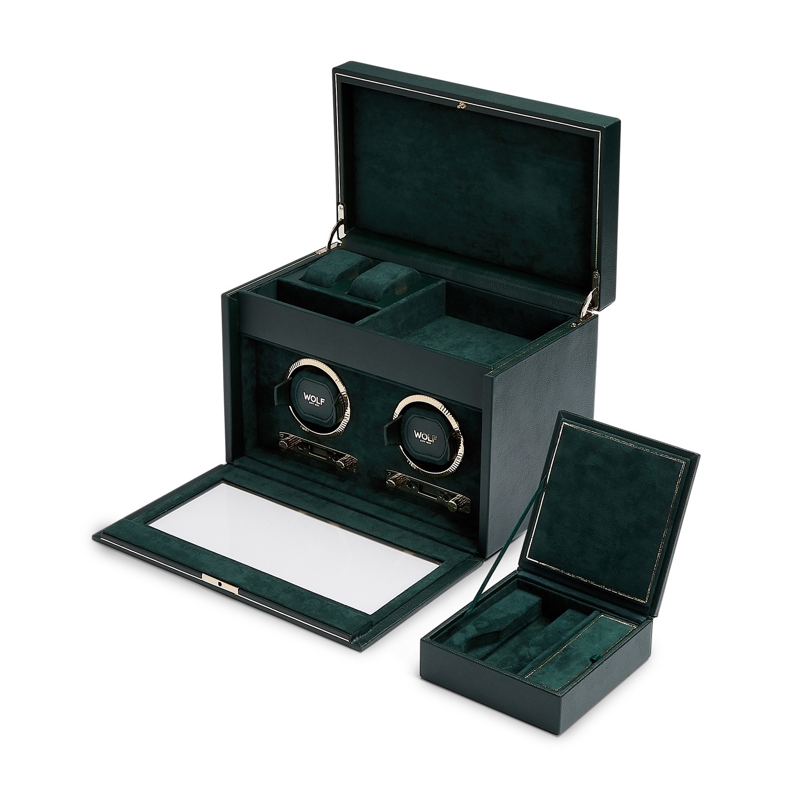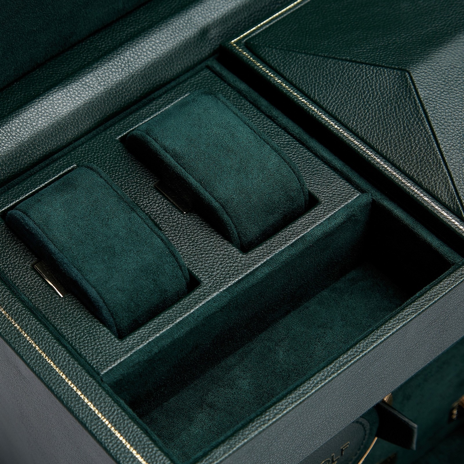 Take your timepieces for a spin in this Wolf Double Watch Winder, with added storage. Handmade, the British Racing models combines the green international motor racing colour of the UK's cars, that were raced in Ireland in the early 1900's, with a revolutionary quad angled and panelled lid. Fine hand finished details include fine gold lines hand pressed onto vegan friendly pebble grained leather. Gold hardware accents add a touch of luxury. Size: 33.66cm length x 19.69cm width x 24.77cm height.