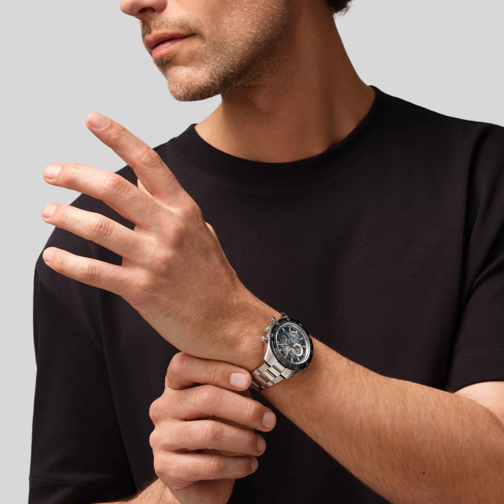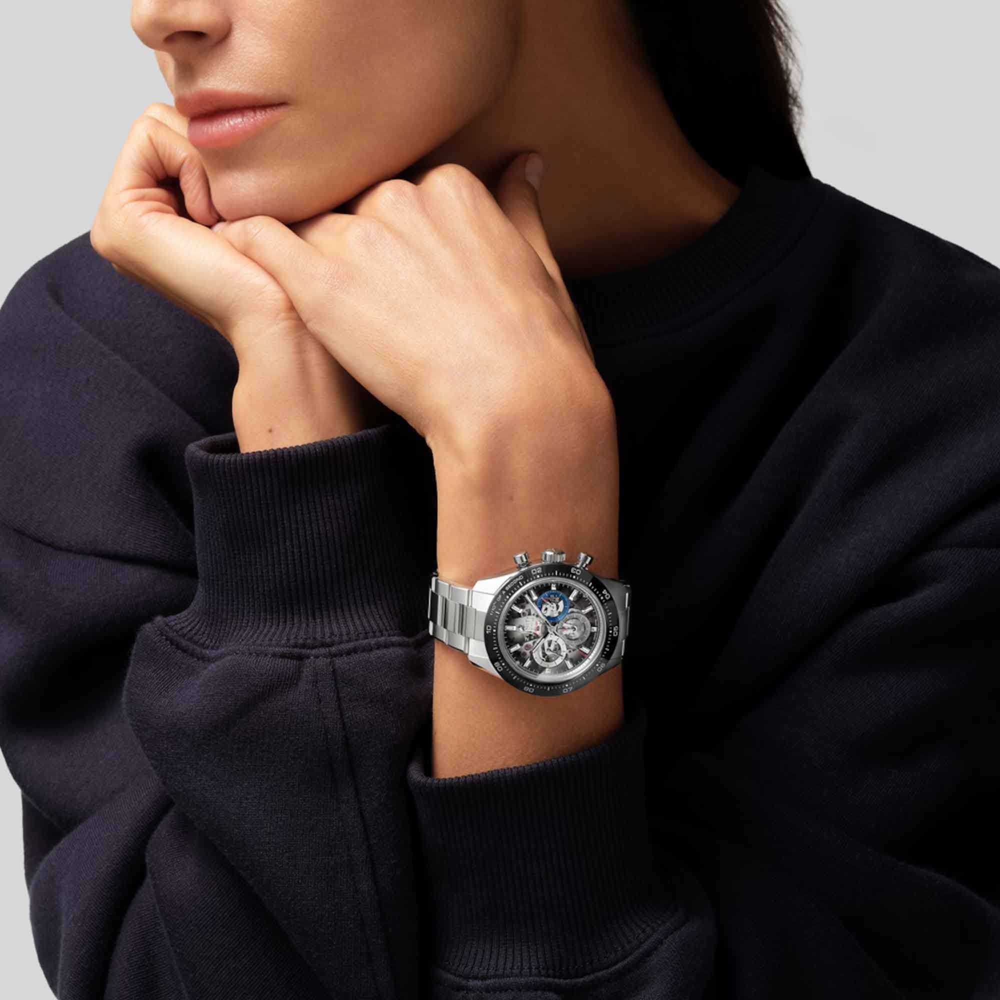 The Chronomaster Sport Skeleton is crafted in a 41mm stainless steel case with a scratch-resistant black ceramic bezel. Its gradient sapphire dial features the brand’s signature 3-6-9 tricolour overlapping counters.