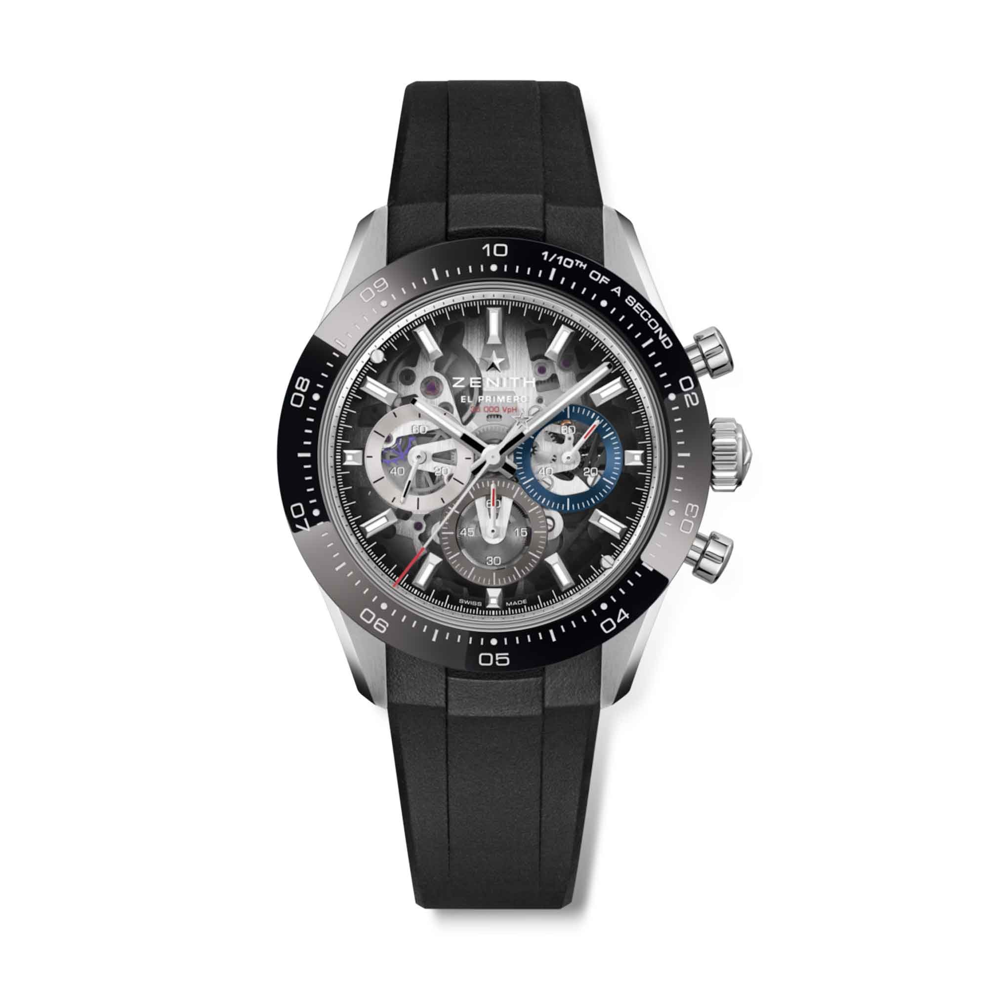 It reveals the openworked architecture of the El Primero 3600 SK, an automatic high-frequency chronograph movement with 1/10th of a second chronograph function and a power reserve of 60 hours. Delivered with a steel bracelet with micro-adjustable folding clasp and an additional black rubber strap.